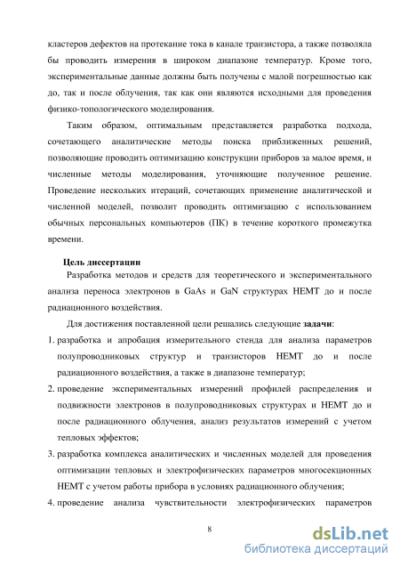В параграфе 1.4 рассмотрены современные методы моделирования электрофизических параметров полевых транзисторов: физико-топологические (метод Монте-Карло, локально полевое и диффузионно-дрейфовое приближения, квазигидродинамическое приближение) и метод эквивалентных схем. Особое внимание уделяется особенностям моделирования работы полупроводниковых приборов в условиях радиационного воздействия. Так же в параграфе описываются классические численные и аналитические модели расчета максимального нагрева кристалла транзистора с секционной конструкцией.