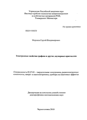 Так продолжалось до 2004 года, когда группа исследователей из Университета Манчестера и ИПТМ РАН (Черноголовка), включая автора диссертации, использовала простой подход для получения графена, что сделало графен одной из самых горячих тем современной физики твердого тела. Отдельная моноатомная плоскость была выделена из трехмерного кристалла графита с помощью техники, называемой микромеханическим расслоением (графит обладает ярко выраженными слоистыми свойствами и