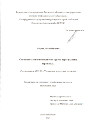 Всё это обусловливает практическую и теоретическую актуальность темы диссертации, направленной на разработку системы организации перевозок грузов через узловые терминалы, без переформирования состава на железнодорожном транспорте.