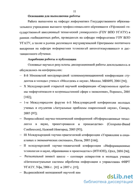 Работа выполнена на кафедре, информатики Государственного образовательного учреждения высшего профессионального образования «Уфимский государственный авиационный технический университет» (ГОУ ВПО УГАТУ) в рамках госбюджетных работ, проводимых на кафедре информатики ГОУ ВПО УГАТУ, а также в рамках реализации внутривузовской Программы поэтапного внедрения на кафедре информатики технологий автоматизированного и дистанционного обучения.