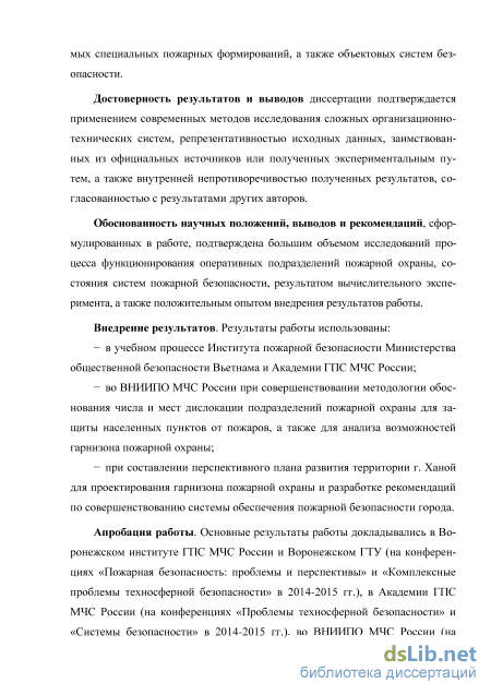 Обоснованность научных положений, выводов и рекомендаций, сформулированных в работе, подтверждена большим объемом исследований процесса функционирования оперативных подразделений пожарной охраны, состояния систем пожарной безопасности, результатом вычислительного эксперимента, а также положительным опытом внедрения результатов работы.