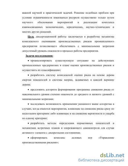 Цель диссертационной работы заключается в разработке механизма комплексного оценивания производственных рисков промышленного предприятия, позволяющего обеспечивать с минимальными затратами допустимый уровень опасности в процессе работы предприятия.