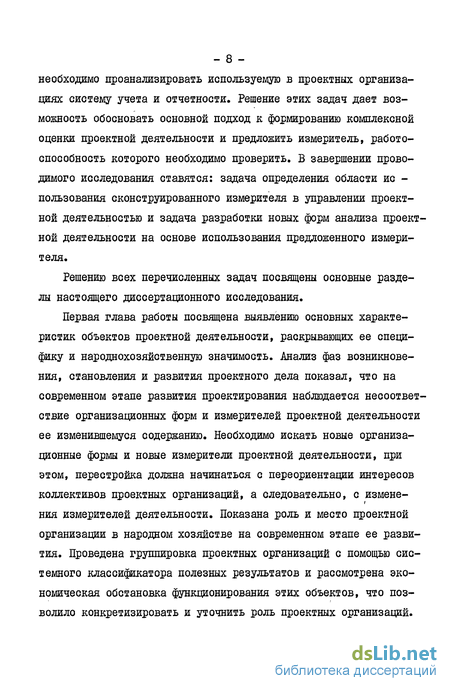 Далее, анализ адекватности используемых и предлагаемых к использованию измерителей и оценок проектной деятельности ее современному содержанию, позволит установить основные требования, которые следует учитывать при разработке измерителя проектной деятельности. Вместе с тем, поскольку любая оценка какой-либо деятельности, в том числе и проектной, опирается на экономические показатели функционирования хозяйственного объекта, которые служат его информационным отображением, постольку - 8 -необходимо проанализировать используемую в проектных организациях систему учета и отчетности. Решение этих задач дает возможность обосновать основной подход к формированию комплексной оценки проектной деятельности и предложить измеритель, работоспособность которого необходимо проверить. В завершении проводимого исследования ставятся: задача определения области ис -пользования сконструированного измерителя в управлении проектной деятельностью и задача разработки новых форм анализа проектной деятельности на основе использования предложенного измерителя.