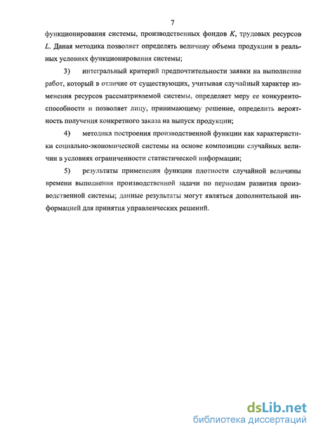 На основе разработанной вероятностной модели и статистических данных построена производственная функция в темпах роста предприятия ООО «Пензенский завод коммунального машиностроения» X = к0 264 373. Данная модель статистически значима и адекватна. Полученные количественные оценки дают возможность управлять предприятием, принимать решение на участие в конкурсе по получению тендера. Анализ полученной модели показал, что эластичность по труду превосходит эластичность по фондам ai a\ (0,373 0,264) - это означает: имеет место фондосберегающее (экстенсивное) направление развития предприятия за исследуемый период. При этом суммарное значение эластичностей не превосходит единицу ai+ot2=0,637 l, следовательно, для развития производственной системы лицу, принимающему решение, необходимо обратить внимание на совершенствование основных фондов и техническое перевооружение предприятия. На основе результатов диссертационной работы были получены следующие выводы и даны предложения. 1. Разработана математическая модель описания поведения социально-экономической системы — предприятия - на основе системного подхода с учётом внутренних и внешних взаимосвязей системы, случайности изменения времени функционирования, фондов, трудовых ресурсов и использования фундаментальных положений теории вероятностей. 2. Получена модель производственной функции со случайными аргументами на основе композиции случайных величин, позволяющая по интегральному критерию предпочтительности обосновать целесообразность размещения заказа на предприятии, принять обоснованное решение по развитию социально-экономической системы. 3. Предложено использование интегрального критерия предпочтительности заявки на выполнение работ для оценки анализа потенциала предприятий. Полученные количественные значения интегрального критерия предпочтительности заявки на выполнение работ Кпр для задачи, рассматриваемой в работе, показывают, что при времени, требуемом на выполнение заказа t3 = 8 месяцев, и времени подготовки, составляющем 8% от времени выполнения заказа, Кпр = 0,96 (96%), при условии, что t3 = 9 месяцев Кпр = 0,87. При увеличении времени выполнения заказа t3 интегральный критерий предпочтительности заявки на выполнение работ Кпр понижается. То есть предпочтительнее для получения тендера будет рассмотрение предприятий, у которых К„р 50%. 4. Впервые предложен алгоритм построения циклограммы работы предприятия. Циклограмма работы предприятия даёт оценку потенциала социально-экономической системы при разработке и производстве изделий с учетом оптимизации ресурсов, что позволяет принимать обоснованные управленческие решения. 5. Методика построения циклограммы производства учитывает отдельные этапы функционирования производственной системы, циклограмма является новым предложением в решении вопросов оценки потенциала предприятия, определении его конкурентоспособности. 6. Предложена методика решения задачи по определению функции плотности вероятности композиции случайных величин, входящих в систему со своими коэффициентами предпочтительности - весовыми коэффициентами. 7. В исследовании предполагалось, что количество основных фондов К и трудовых ресурсов L подчиняется различным законам распределения и на основании этого смоделированы различные виды плотности р