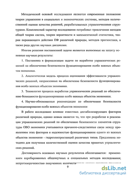 Цель диссертационного исследования - разработать методическое обеспечение для оценивания эффективности управленческих решений по обеспечению надежности функционирования особо важных объектов экономики. Основная сложность в её решении заключается в отсутствии системно изложенных закономерностей по выработке управленческих решений по обеспечению безопасности функционирования особо важных объектов экономики.