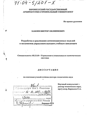 Целью диссертации является разработка и реализация комплекса моделей, механизмов и методов по оптимизации управления ВУЗом.