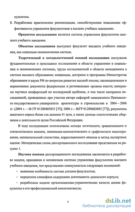 Теоретической и методологической основой исследования послужили фундаментальные и прикладные исследования в области управления в социальных и экономических системах, труды исследователей в области менеджмента в системе высшего образования; концепции, доктрины и программы Министерства образования и науки РФ по вопросам развития высшей школы; законодательные и нормативные документы федеральных и региональных органов власти; материалы научных конференций по исследуемой проблеме, в том числе материалы исследований, проведенных при участии автора кафедрой менеджмента Пензенского государственного университета архитектуры и строительства в 2004 - 2006 гг. (2004 г. -№ ГР 01200405055 [75]; 2006 г.-№ГР 01200603693 [77]), результаты анкетного опроса более ста деканов 41 вуза, а также данные статистических сборников о деятельности вузов Российской Федерации.