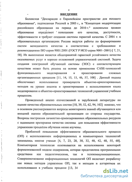 Болонская "Декларация о Европейском пространстве для высшего образования", подписанная Россией в 2003 г., и "Концепция модернизации российского образования на период до 2010 г." основными целями образования определяют повышение его качества, доступности, эффективности и требуют создания системы гарантий качества. С 2001 г. в образовательных организациях России ведутся работы по формированию систем менеджмента качества в соответствии с требованиями и рекомендациями ISO серии 9001:2001 (ГОСТР ИСО серии 9001-2001) [ 7, 21, 58]. Их выполнение является общепринятой гарантией устойчивого качества оказываемых услуг и хорошо отлаженной управленческой системой. Задача создания электронной обучающей системы (ЭОС) с соответствующим качеством может быть решена на основе применения CASE-технологий функционального моделирования и проектирования сложных организационных процессов [11, 14, 15, 15, 46, 57, 108] . Данный подход обеспечивает использование преимуществ объектно-ориентированных методов на уровне анализа и проектирования с использованием языка моделирования и объектно-ориентированных технологий управления учебным процессом.