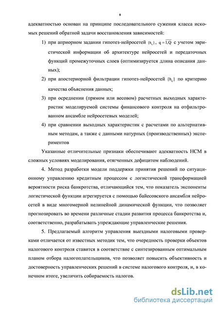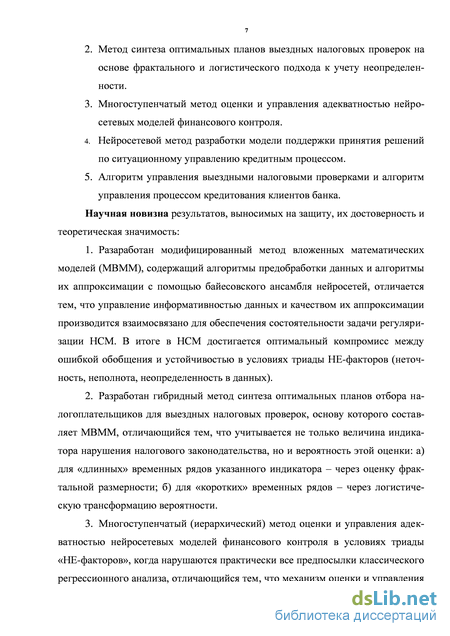 Объектом исследования в работе являются процессы управления в системах финансового контроля, на примере задач налогового контроля и диагностики банкротств. Несмотря на различие в деталях, указанные классы задач имеют общую методологическую и теоретическую основу. Методологической основой является концептуальный базис нейросетевого моделирования экономических систем, функционирующих в условиях неопределенности. Теоретической основой являются конкретные методы построения устойчивых нейросе-тевых моделей (НСМ).