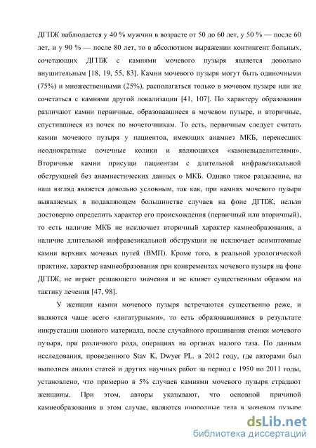 У женщин камни мочевого пузыря встречаются существенно реже, и являются чаще всего «лигатурными», то есть образовавшимися в результате инкрустации шовного материала, после случайного прошивания стенки мочевого пузыря, при различного рода, операциях на органах малого таза. По данным исследования, проведенного Stav K, Dwyer PL. в 2012 году, где авторами был выполнен анализ статей и других научных работ за период с 1950 по 2011 годы, установлено, что примерно в 5% случаев камнями мочевого пузыря страдают женщины. При этом, авторы указывают, что основной причиной камнеобразования в этом случае, являются инородные тела в мочевом пузыре (швы, сетки для пластики и т.д.) [104]. Кроме того в данной работе авторы указывают, что методом выбора при удалении камней мочевого пузыря должна быть контактная цистолитотрипсия. Причем в случае, когда камень является «лигатурным» (в большинстве наблюдений), его эндоскопическое удаление должно осуществляться вместе с причиной, приведшей к его образованию, то есть вместе с лигатурой. А при невозможности удаления конкремента эндоскопическим путем, ввиду, например, его больших размеров, авторы рекомендуют использовать другие методы (ДЛТ, цистолитотомия).