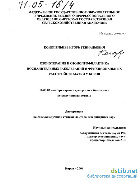 Конопельцев Игорь Геннадьевич. Озонотерапия и озонопрофилактика воспалительных заболеваний и функциональных расстройств матки у коров : Дис. ... д-ра вет. наук : 16.00.07 Киров, 2004 361 с. РГБ ОД, 71:05-16/4