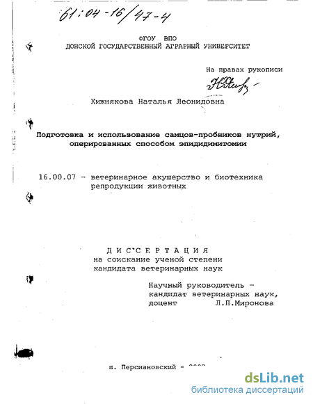 РЕАЛИЗАЦИЯ РЕЗУЛЬТАТОВ ИССЛЕДОВАНИЙ. Разработанные / практические предложения реализуются в производстве (акты см. в приложении) . Данные диссертации используются в учебном процессе при проведении занятий по курсам «Ветеринарное акушерство и биотехника репродукции животных», «Болезни пушных зверей» на факультете ветеринарной медицины ДонГАУ, изложены в научно практических рекомендациях «Анатомо-топографическая /ф характеристика воспроизводительной системы самцов нутрий и операции на половых органах», утверждённых и рекомендованных к внедрению Управлением ветеринарии Ростовской области (протокол №51 от 19 октября 2001 г.).