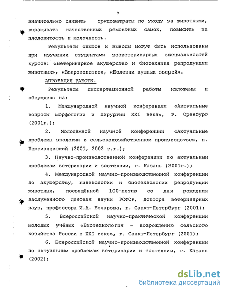 АПРОБАЦИЯ РАБОТЫ. f Результаты диссертационной работы изложены и обсуждены на: 1. Международной научной конференции «Актуальные вопросы морфологии и хирургии XXI века», г. Оренбург (2001г.); 2. Молодёжной научной конференции «Актуальные /м проблемы экологии в сельскохозяйственном производстве», п. Персиановский (2001, 2002 г.г.); 3. Научно-производственной конференции по актуальным проблемам ветеринарии и зоотехнии, г. Казань (2001г.); 4. Международной научно-производственной конференции по акушерству, гинекологии и биотехнологии репродукции животных, посвященной 100-летию со дня рождения заслуженного деятеля науки РСФСР, доктора ветеринарных наук, профессора И.А. Бочарова, г. Санкт-Петербург (2001); 5. Всероссийской научно-практической конференции молодых учёных «Биотехнология — возрождению сельского хозяйства России в XXI веке», г. Санкт-Петербург (2001); 6. Всероссийской научно-производственной конференции по актуальным проблемам ветеринарии и зоотехнии, г. Казань (2002); 7. Международной научно-практической конференции w «Актуальные проблемы болезней молодняка в современных условиях», г. Воронеж (2002); 8. кэасширенном заседании кафедры акушерства и хирургии ФГОУ ВПО «ДонГАУ», протокол №5 от 20 марта 2003г. По материалам диссертационной работы был выигран конкурс 2002 г., объявленный Федеральной целевой программой «Интеграция науки и высшего образования России f на 2002-2006 годы». В качестве награды была присуждена оплачиваемая трёхмесячная стажировка в ведущее научно-исследовательское учреждение, занимающееся изучением проблем пушного звероводства - ГНУ «НИИ ПЗК им. В. А. Афанасьева»