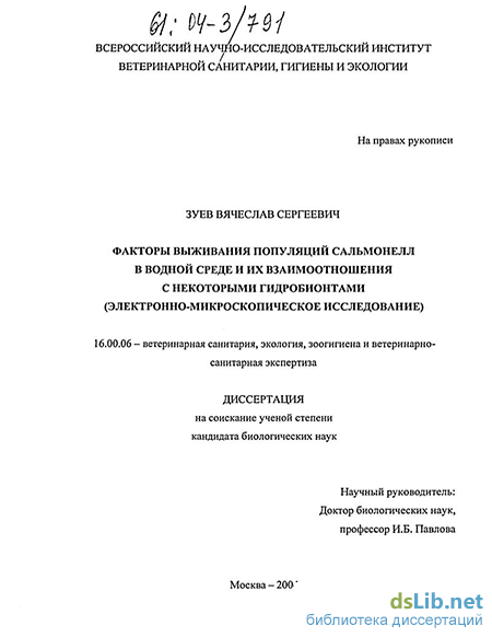 В этой связи актуальным является изучение факторов выживания популяций сальмонелл в водной среде и путей их циркуляции, связанных с различными гидробионтами.
