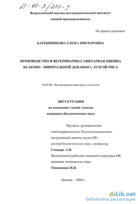 Барышникова Елена Викторовна. Производство и ветеринарно-санитарная оценка белковоминеральной добавки с лузгой риса : диссертация ... кандидата биологических наук : 16.00.06.- Москва, 2000.- 120 с.: ил. РГБ ОД, 61 00-3/247-9