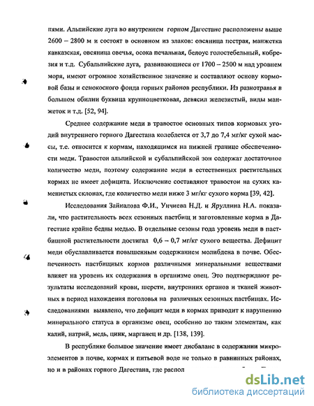 В растениях отмечена такая же закономерность, т.е. содержание меди в травах Присулакских пастбищ не превышает 6,26 мг/кг сухого вещества, а в горных - не менее 8,20 мг/кг сухого вещества, т.е. на 31 % выше. Содержание молибдена в травах Присулакских пастбищ соответственно равнялось 1,81 мг/кг сухого вещества, а горных - 0,28 мг/кг сухого вещества или в 6,5 раз ниже. Эти данные позволяют заключить, что как в почве, так и в растительных кормах на территории Присулакской зоны отмечается значительный избыток молибдена и вместе с тем выраженная недостаточность в содержании меди.