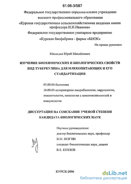 Цель и задачи исследований. Целью работы было изучение биохимических и биологических свойств туберкулина очищенного (ППД) для млекопитающих, а также сравнительное изучение методов контроля качества туберкулина очищенного (ППД) для млекопитающих и его стандартизация.
