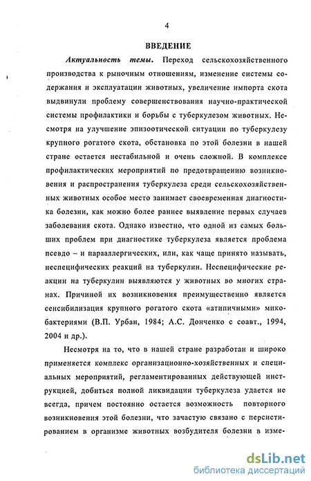 В последние десятилетия одним из наиболее актуальных вопросов ветеринарной фтизиатрии является дифференциация аллергических реакций на ППД-туберкулин для млекопитающих Довольно высокая частота обнаружения неспецифических реакций в благополучных по туберкулезу стадах крупного рогат ого скота привела к тому, что внутрикожная туберкулиновая проба потеряла значимость как единственный, достоверный и эффективный метод прижизненной диагностики туберкулеза Внутрикожная туберкулиновая проба стала лишь ориентировочной при первичной постановке диагноза на туберкулез в хозяйствах, считающихся благополучными по этой инфекции (И А Баку лов, 1976, ВП Урбан, 1982, АС Допченко, В Н Донченко, 1972, 1994, НМ Колычев с соавт, 1992, 2004, ВН Кисленко,1998,АН Шаров с соавт ,1980, Ю Я Кассич с соавт , 1990, Н П Овдиенко, 1990, Н А Шкиль,1995, В Г Луницын,1998, В И Околелов, 2001, Р А Нуратинов с соавт ,2001, А X Найманов 2004, и др )