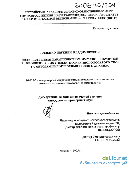 Актуальность темы. Всестороннее исследование иммуноглобулинов, одного из важнейших факторов иммунитета, представляет пристальный интерес для иммунологов и клиницистов. Он связан с тем, что особенностями свойств отдельных изотипов иммуноглобулинов объясняется характер взаимодействия антител с антигеном и способ элиминации последнего, а также характер патофизиологических реакций организма в случае иммунологического конфликта (Д.В.Стефани, 1975). Клинические и биологические аспекты исследования иммуноглобулинов животных многообразны, их определение имеет крайне важное значение для оценки иммунного статуса организма, диагностики иммунодефицитных состояний. Важнейшим условием для развертывания широкого фронта работ по количественному определению уровня иммуноглобулинов в биологических жидкостях организма является создание простых, доступных и информативных лабораторных методов исследования. Определение уровня иммуноглобулинов в различных биологических жидкостях организма животных проводится многими исследователями в течение ряда лет (Р.В.Боровик, 1978; П.А.Емельяненко, 1982; В.М. Чеки-шев, 1984; Ю.Н.Федоров, 1985; А.Б.Маркунас, 1988; Р.Х.Кармолиев, 1988; Ю.К.Пешкус, 1991; М.Д.Смердова, 2000; P.Porter, 1971; K.Bourne, 1971; J.P. Mach, JJ.Pahud, 1971; J.R.Duncan et al., 1972; J.Butler, 1974, 1983; M.R. Williams et al., 1975, 1990; D.Levieux, A.Olliver, 1999). Однако до настоящего времени существуют расхождения в полученных данных различными авторами. Эти различия в количественной характеристике обусловлены отсутствием стандартных методик получения биологических жидкостей для исследования и тем, что для иммунологического анализа биологических жидкостей различные авторы используют разные по чувствительности и специфичности методы: турбодиметрический, радиальную иммунодиффузию и иммуноферментный анализ. В последние годы периферическая кровь остается основной биологической жидкостью для иммунологического исследо-