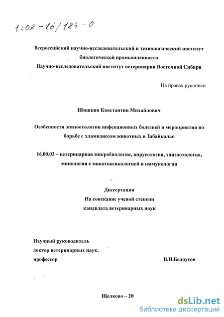 Шишкин Константин Михайлович. Особенности эпизоотологии инфекционных болезней и мероприятия по борьбе с хламидиозом животных в Забайкалье : диссертация ... кандидата ветеринарных наук : 16.00.03.- Щелково, 2002.- 125 с.: ил. РГБ ОД, 61 02-16/127-0