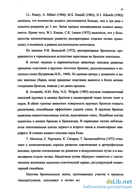 Наличие бронхиальных желез, принимающих участие в процессе терморегуляции, описывают в легких млекопитающих S. Engel, 1962; S.P. Sorokin, 1965; НИ. Гребенская, 1969. Авторы указывают на слабое развитие бронхиальных желез у млекопитающих с хорошо развитыми потовыми железами (осел, лошадь). Отмечено также, что у домашних животных с выраженной подкожной жировой клетчаткой, густым шерстным покровом бронхиальные железы развиты лучше, чем у диких животных (лось, косуля).