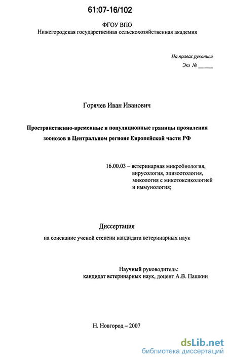 Горячев Иван Иванович. Пространственно-временные и популяционные границы проявления зоонозов в Центральном регионе Европейской части РФ : дис. ... канд. вет. наук : 16.00.03 Нижний Новгород, 2007 172 с. РГБ ОД, 61:07-16/102