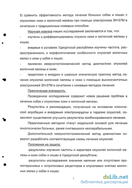 Внедрения. Результаты исследований внедрены в лечебно-консультационных центрах (отделах) при Ижевской государственной ветеринарной станции при оперативном лечении онкологически больных собак и кошек, а также в учебный процесс ФГОУ ВПО ИжГСХА, Казанской ГАВМ, Ульяновской ГАВМ, Санкт-Петербургской ГАВМ, Саратовского ГАУ.