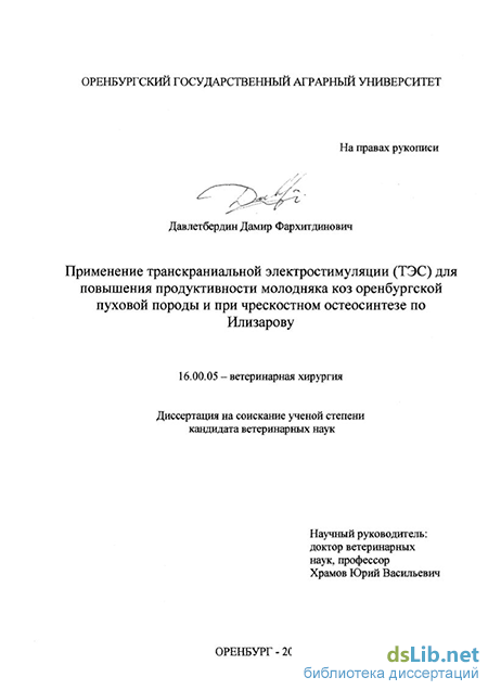 Давлетбердин Дамир Фархитдинович. Применение транскраниальной электростимуляции (ТЭС) для повышения продуктивности молодняка коз оренбургской пуховой породы и при чрескостном остеосинтезе по Илизарову : диссертация ... кандидата ветеринарных наук : 16.00.05.- Оренбург, 2002.- 143 с.: ил. РГБ ОД, 61 03-16/71-4