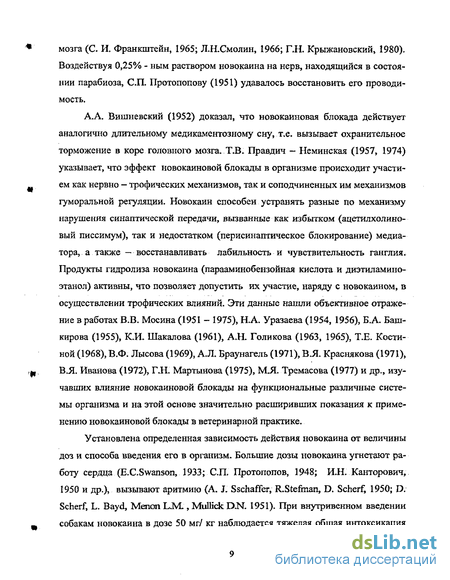 Эти положения выявлены А.В. Вишневским в процессе длительного наблюдения и изучения механизма действия новокаиновых блокад. Результаты этих исследований легли в основу учения о патогенетической (неспецифической) терапии при лечении воспалительных процессов у людей. Основоположник этого метода лечения академик А.В. Вишневский рассматривал новокаиновую блокаду как комплексное воздействие на центральный и периферический отделы нервной системы. Учитывая изложенные, мы проводили разносторонние экспериментальные и клинические исследования на разных видах животных.