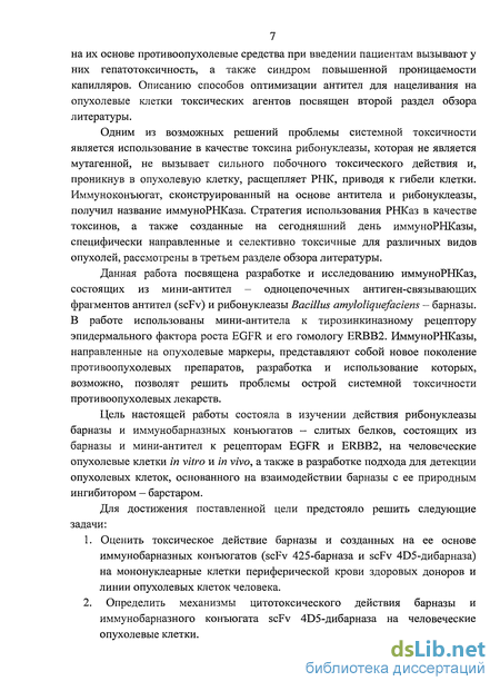Данная работа посвящена разработке и исследованию иммуноРНКаз, состоящих из мини-антител — одноцепочечных антиген-связывающих фрагментов антител (scFv) и рибонуклеазы Bacillus amyloliquefaciem - барназы. В работе использованы мини-антитела к тирозинкиназному рецептору эпидермального фактора роста EGFR и его гомологу ERBB2. ИммуноРНКазы, направленные на опухолевые маркеры, представляют собой новое поколение противоопухолевых препаратов, разработка и использование которых, возможно, позволят решить проблемы острой системной токсичности противоопухолевых лекарств.