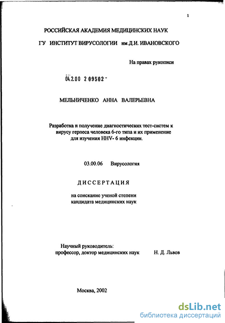 Мельниченко Анна Валерьевна. Разработка и получение диагностических тест-систем к вирусу герпеса человека 6-го типа и их применение для изучения HHV-6 инфекции : диссертация ... кандидата медицинских наук : 03.00.06 / Мельниченко Анна Валерьевна; [Место защиты: Государственное учреждение "Научно-исследовательский институт вирусологии РАМН"].- Москва, 2002.- 100 с.: ил.