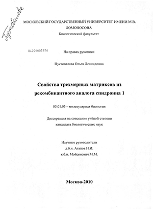 Актуальность проблемы. Развитие клеточных технологий и вовлечение новых методов молекулярной биологии открывает возможности для восстановления значительных дефектов тканей и органов с использованием созданных in vitro искусственных тканей. Основой искусственных тканей становятся носители трехмерного строения (их называют матриксами или матрицами), которые служат субстратом для адгезии аутологичных клеток, способствуя поддержанию их пролиферативной активности, определяют форму и физико-механические свойства медицинского изделия. В наше время предпочтение отдается полимерам биологического происхождения или композитным материалам на их основе, так как они, обладая высокой прочностью, не оказывают токсического действия, и более того, могут служить высокоэффективными биостимуляторами. Уникальным материалом, сочетающим высокую прочность и эластичность, является шелк паутинной нити. Эти свойства, наряду с хорошей биологической совместимостью, делают шелк перспективным материалом для использования в тканевой инженерии. Однако получение природного паутинного шелка связано со значительными трудностями и обычно нерентабельно, а количество шелка недостаточно для широкого практического применения. Успехи в расшифровке генов паутинных белков и создание их рекомбинантных аналогов позволило получить материалы, подобные природному шелку. В настоящее время исследуются свойства этих материалов, а также возможность их практического использования. В ГосНИИгенетика ранее был получен белок 1F9 - аналог спидроина 1 Nephila clavipes [Богуш В.Г. и др., 2006; Bogush V.G. et al., 2009], который может стать основой при создании матриксов для тканевой инженерии