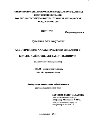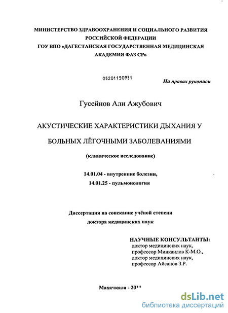Научная новизна. Впервые проведено исследование лёгочных акустических проявлений (компьютерный цифровой анализ дыхательных шумов) в сочетании с другими методами респираторной физиологии.