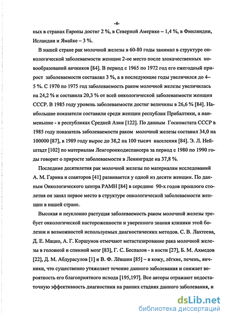 Высокая и неуклонно растущая заболеваемость раком молочной железы требует онкологической настороженности и уверенного знания клиники этой болезни и возможностей используемых диагностических методов. С. В. Лахтеева, Д. Е. Мацко, А. Г. Коршунов отмечают метастазирование рака молочной железы в головной и спинной мозг [83], Г. С. Беспалов - в кости [27], Б. М. Ахмедов [22], Д. М. Абдурасулов [1] и В. Ф. Лёвшин [85] - в кожу, лёгкие, печень, яичники, что существенно утяжеляет течение данного заболевания и снижает вероятность его благоприятного исхода [195,197]. Все авторы отражают недостаточную эффективность диагностики на ранних стадиях данного заболевания, и