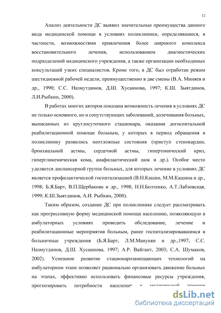 Опыт организации работы ДС для больных терапевтического профиля с оценкой положительных аспектов работы и анализом медицинской и социальной эффективности получил освещение в работах ученых 90-х гг. XX века и в первые десятилетия настоящего столетия (СИ. Шляфер 1999; К.Ш. Зыятдинов, 2000; А.Р. Вайгант,2003; В.Я.Горбунков, А.Л. Нициевский, 2003; А.С Даненков, Н.А. Даненкова, 2004; Д.В. Пивень и др., 2005). Авторами выдвинут целый ряд медицинских и организационных вопросов, касающихся повышения эффективности деятельности ДС и требующих дальнейшего решения. Показано, что в структуре больных, госпитализированных в ДС терапевтического профиля, 38% составили больные с сердечно-сосудистой патологией; 22,5% - с болезнями органов пищеварения; 11,1% больных с болезнями органов дыхания; 9,7% - проходили лечение по поводу болезней костно-мышечной системы и соединительной ткани; 12,4% - с другими болезнями (А.А. Калининская, О.В. Шапекина, СИ. Шляфер, 2000; СИ. Шляфер 1999, 2004). Основу комплексной терапии для терапевтических больных (заболевания легких, сердечнососудистой системы, желудочно-кишечного тракта) составило инфузионное капельное введение лекарственных препаратов, применяемых при той или иной патологии. Согласно проведенным исследованиям лечение в ДС позволило получить выраженный положительный эффект у 86,5% больных. По окончании лечения в ДС были выписаны на работу 84,7% больных и только 0,4% были переведены в стационарные отделения больниц. При этом около 85% больных нуждались в повторных курсах лечения, так как контингент больных ДС представлен в основном лицами, страдающими хроническими заболеваниям, которые требуют профилактических курсов лечения до 2-3 раз в году (Шипова, В.М, 2003; В.Т.Карташов, В.В. Романовский, 2003; Ярохно В.И. 2005).