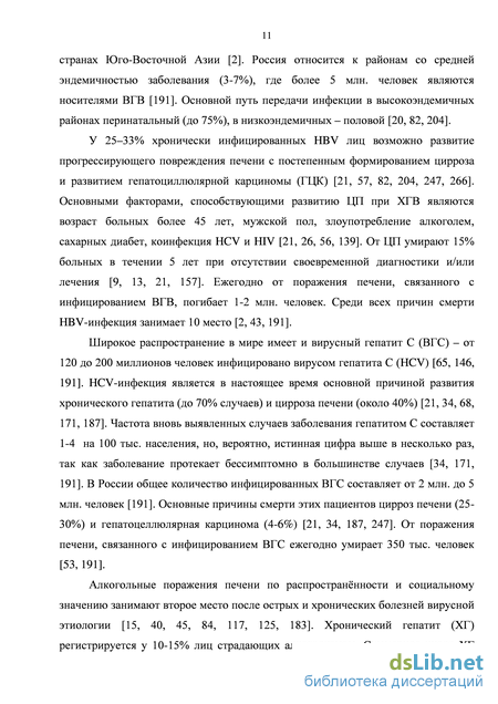 У 25–33% хронически инфицированных HBV лиц возможно развитие прогрессирующего повреждения печени с постепенным формированием цирроза и развитием гепатоциллюлярной карциномы (ГЦК) [21, 57, 82, 204, 247, 266]. Основными факторами, способствующими развитию ЦП при ХГВ являются возраст больных более 45 лет, мужской пол, злоупотребление алкоголем, сахарных диабет, коинфекция HCV и HIV [21, 26, 56, 139]. От ЦП умирают 15% больных в течении 5 лет при отсутствии своевременной диагностики и/или лечения [9, 13, 21, 157]. Ежегодно от поражения печени, связанного с инфицированием ВГВ, погибает 1-2 млн. человек. Среди всех причин смерти HBV-инфекция занимает 10 место [2, 43, 191].