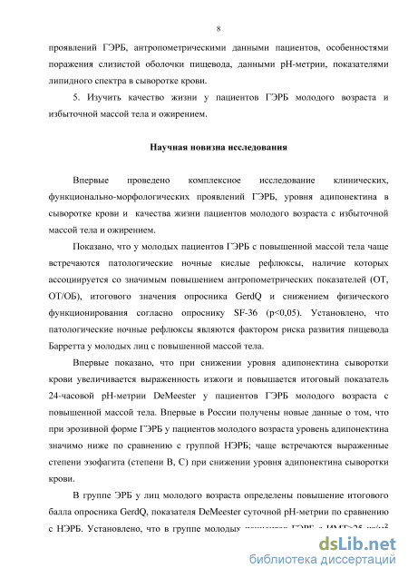 Научная новизна исследования. Впервые проведено комплексное исследование клинических, функционально-морфологических проявлений ГЭРБ, уровня адипонектина в сыворотке крови и качества жизни у пациентов молодого возраста с избыточной массой тела и ожирением.