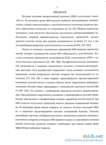 Одним из основных клинических проявлений ММ является поражение костей, которое в развернутой стадии ММ наблюдается у всех больных. Костные изменения проявляются остеолизисом (ОЛ), остеопорозом (ОП) и патологическими переломами (N. Giciliani at al., 2006). Патофизиологические механизмы ОЛ заключаются в секреции миеломными клетками остеокла-стактивирующих факторов. Под воздействием возросшего числа активных остеокластов происходит полное разрушение костной матрицы без последующего ее замещения (Н.В. Любимова, Н.Е. Кушлинский, 2006; В.Л. Мат-лан, 2006; L. Ehrlich et al., 2005). ОП в свою очередь характеризуется прогрессирующим снижением костной массы в единице объема кости, нарушением микроархитектоники костной ткани, приводящим к повышенной хрупкости костей (М. Вуд, П. Банн, 2001; N.Giciliani at al. 2006; R. Berenson, 2002). Это связано с дисбалансом процессов костного ремоделирования, обусловленного нарушением резорбции и формирования костной ткани. Ранняя диагностика и своевременное лечение поражений костей скелета при ММ остается актуальной проблемой многих разделов клинической медицины. В настоящее время нельзя говорить не только о полном излечении ММ, но и надежном предотвращении костных осложнений болезни. Поэтому дальнейшее изучение патофизиологических механизмов развития остеодеструктив-ного синдрома у больных ММ является одним из важнейших аспектов данной патологии, решение которого необходимо для поиска более эффективных программ терапии.
