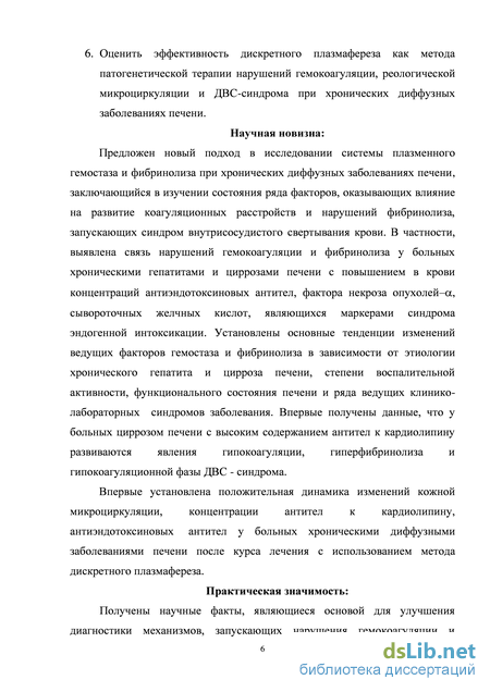 Оценить эффективность дискретного плазмафереза как метода патогенетической терапии нарушений гемокоагуляции, реологической микроциркуляции и ДВС-синдрома при хронических диффузных заболеваниях печени.
