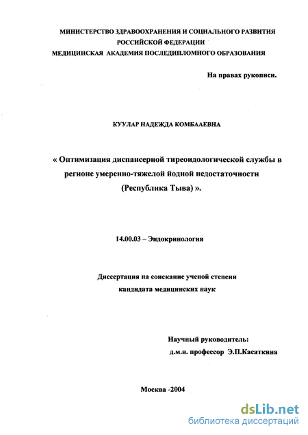 Основные положения диссертации доложены на: научно-практической конференции «Неотложные мероприятия по ликвидации йоддефицитных состояний в Республике Тыва» (Кызыл, 2000), научной конференции «Проблемы развития и сохранения тывинского генофонда: теория и практика» (Кызыл, 2001), научно-практической конференции «Проблемы адаптации территориального здравоохранения к условиям рыночной экономики. Состояние здоровья населения Республики Тыва, его тенденции и перспективы» (Кызыл, 2002). Апробация диссертации состоялась на совместной конференции кафедры эндокринологии детского и подросткового возраста, кафедры эндокринологии и диабетологии РМАПО МЗ и СР РФ (г. Москва) 26.03.2004г.
