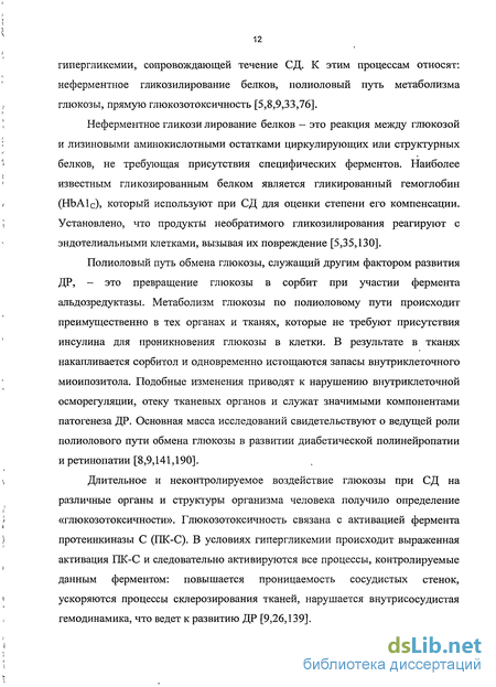 Согласно опубликованных в последние годы научных работ, существует несколько теорий патогенеза диабетической микроангиопатии, однако ни одна их них полностью не раскрывает причинно-следственные связи между начальными симптомами заболевания и характерными фазами течения ДР [51,131,150]. На современном этапе развития науки многочисленные эпидемиологические и клинические исследования, в том числе на моделях сахарного диабета у животных, позволяют с достаточной степенью уверенности констатировать, что одним из самых важных факторов, участвующих в развитии сосудистой патологии, является хроническая гипергликемия и длительность существования СД, в то время как другие аспекты развития ДР требуют дальнейшего изучения [11,39,42,52,139,147,209].