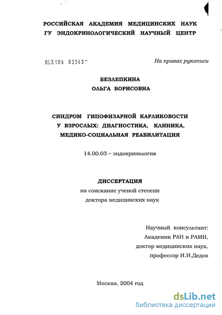 Представленная работа является первым в России комплексным исследованием различных аспектов врожденной соматотропной недостаточности у взрослых.
