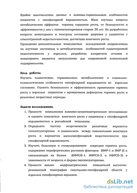 Изучить клинические, гормональные, метаболические и социально-психологические особенности гипофизарной карликовости во взрослом состоянии. Оценить безопасность и эффективность применения гормона роста у взрослых пациентов с врожденным дефицитом гормона роста в различные возрастные периоды.