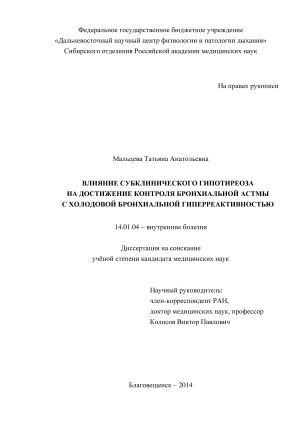 - Состояние баланса системы провоспалительных и противовоспалительных цитокинов у больных бронхиальной астмой с холодовой гиперреактивностью бронхов при субклиническом гипотиреозе