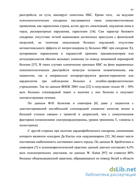 По мнению А.М. Вейна и соавторов [11] психовегетативные нарушения как клинические проявления невротического расстройства следует одновременно рассматривать как важнейший фактор патогенеза соматически-нейрогенных расстройств. Установлено, что психоэмоциональные переживания играют большую роль в возникновении приступов стенокардии, при этом эмоциональное напряжение сопряжено с болевыми и вегетативными феноменами [22]. Зачастую у данной категории больных клиническими эквивалентами ИБС становятся симптомы соматовегетативного, психологического характера. Многие авторы обращают внимание на дифференциально-диагностические трудности распознавания сердечно-сосудистых заболеваний у таких пациентов, так как первые клинические признаки ИБС появляются в периоды декомпенсации психопатологических расстройств на фоне актуальных психосоциальных стрессорных факторов, являющихся мотивом обращения больных к психиатру. При этом преобладание в клинической картине депрессивных и тревожных расстройств, по сути, маскирует симптомы ИБС. Кроме того, на ведущие психопатологические синдромы наслаиваются такие соматовегетативные проявления, как пароксизмы страха, алгии других локализаций, ощущения кома в горле, респираторные нарушения, парестезии [16]. Сам характер болевого синдрома: отсутствие четкой взаимосвязи ангинозных приступов с физической нагрузкой, не типичная локализация болевых ощущений, отсутствие антиангинального эффекта от нитроглицерина (у больных ИБС при синдроме Х), купирование пароксизмов и кардиалгий приемом транквилизаторов или антидепрессантов обычно вызывает сомнение по поводу возможной коронарной болезни [37]. В таких случаях клинические признаки ИБС на фоне выраженных психопатологических расстройств зачастую остаются незамеченными, как пациентом, так и неправильно интерпретируются врачом-терапевтом или кардиологом при наблюдении больных в лечебно-профилактических учреждениях. Так по данным ВНОК 2004 года [22] в популяции только 40 – 50% всех больных стенокардией знают о наличии у них болезни и получают соответствующее лечение. По данным Ф.И. Белялова и соавторов [6] даже у пациентов с диагностированной нестабильной стенокардией снижение качества жизни в большей степени связано с тревогой и депрессией, чем с соматическими факторами (изменениями электрокардиограммы, уровня тропонина Т, глюкозы и холестерина).