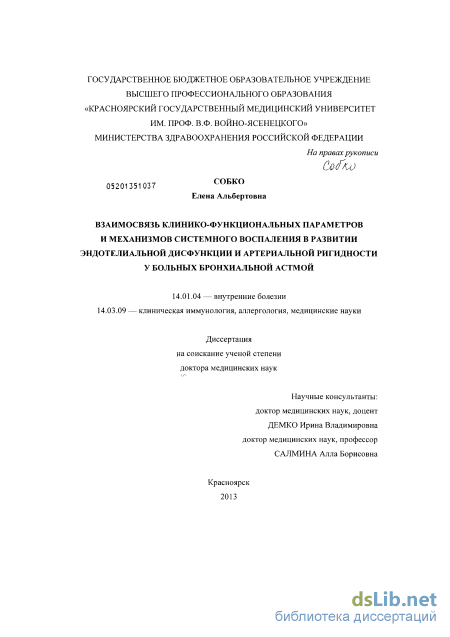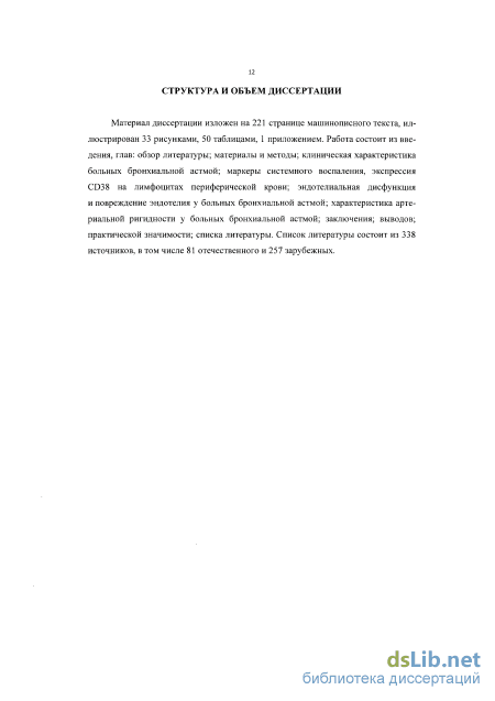 Материал диссертации изложен на 223 страницах машинописного текста, иллюстрирован 32 рисунками, 50 таблицами, 1 приложением. Работа состоит из введения, следующих глав: обзор литературы, материалы и методы, клиническая характеристика больных бронхиальной астмой, маркеры системного воспаления, экспрессия CD38 на лимфоцитах периферической крови; эндотелиальная дисфункция и повреждение эндотелия у больных бронхиальной астмой, характеристика артериальной ригидности у больных бронхиальной астмой; заключения; выводов; практической значимости; списка литературы. Список литературы состоит из 338 источников, в том числе 81 отечественных и 257 зарубежных.