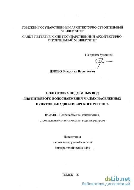 Работа выполнена на кафедре водоснабжения и водоотведения в Томском государственном архитектурно-строительном университете и на кафедре водоснабжения в Санкт-Петербургском архитектурно-строительном университете в соответствии с планом НИР и является обобщением результатов исследований, проведенных автором и под его руководством в течение 15 лет на реальных объектах Западно-Сибирского региона.