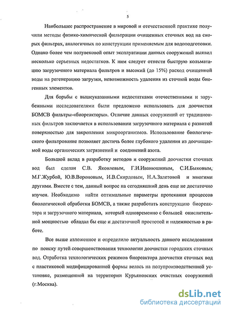Ha сегодняшний день, в подавляющем большинстве случаев, для целей третичной очистки хозяйственно-бытовых сточных вод используются скорые фильтры, аналогичные применяемым для водоподготовки. Данные сооружения просты и надежны в эксплуатации, однако имеют следующие недостатки: быстрое заиливание, невозможность удаления из сточной воды остаточных органических загрязнений и биогенных элементов. Для решения данной проблемы отечественными и зарубежными исследователями предложено использовать фильтры-«биореакторы» или биореакторы доочистки, использующие иммобилизировашгую биомассу для глубокого удаления органических загрязнений и соединений азота.
