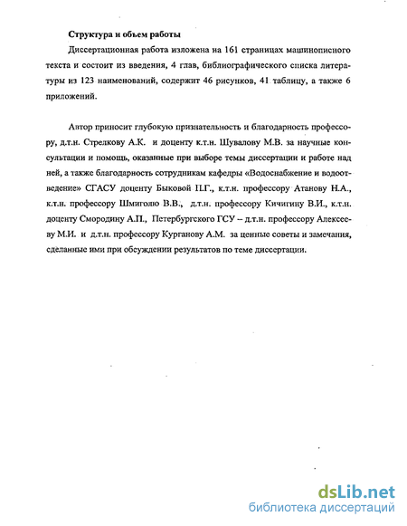 Автор приносит глубокую признательность и благодарность профессору, д.т.н. Стрелкову А.К. и доценту к.т.н. Шувалову М.В. за научные консультации и помощь, оказанные при выборе темы диссертации и работе над ней, а также благодарность сотрудникам кафедры «Водоснабжение и водоот-ведение» СГАСУ доценту Быковой П.Г., к.т.н. профессору Атанову Н.А., к.т.н. профессору Шмиголю В.В.> д.т.н. профессору ІСичигину В.И., к.т.н. доценту Смородину А.П., Петербургского ГСУ - д.т.н. профессору Алексееву М.И. и д.т.н. профессору Курганову A.M. за ценные советы и замечания, сделанные ими при обсуждении результатов по теме диссертации.
