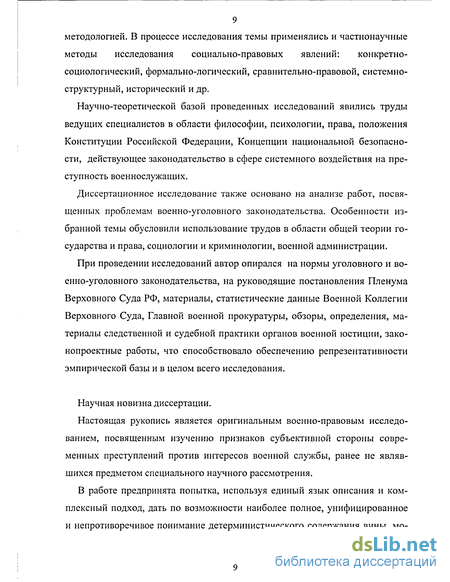 При проведении исследований автор опирался на нормы уголовного и военно-уголовного законодательства, на руководящие постановления Пленума Верховного Суда РФ, материалы, статистические данные Военной Коллегии Верховного Суда, Главной военной прокуратуры, обзоры, определения, материалы следственной и судебной практики органов военной юстиции, законопроектные работы, что способствовало обеспечению репрезентативности эмпирической базы и в целом всего исследования.